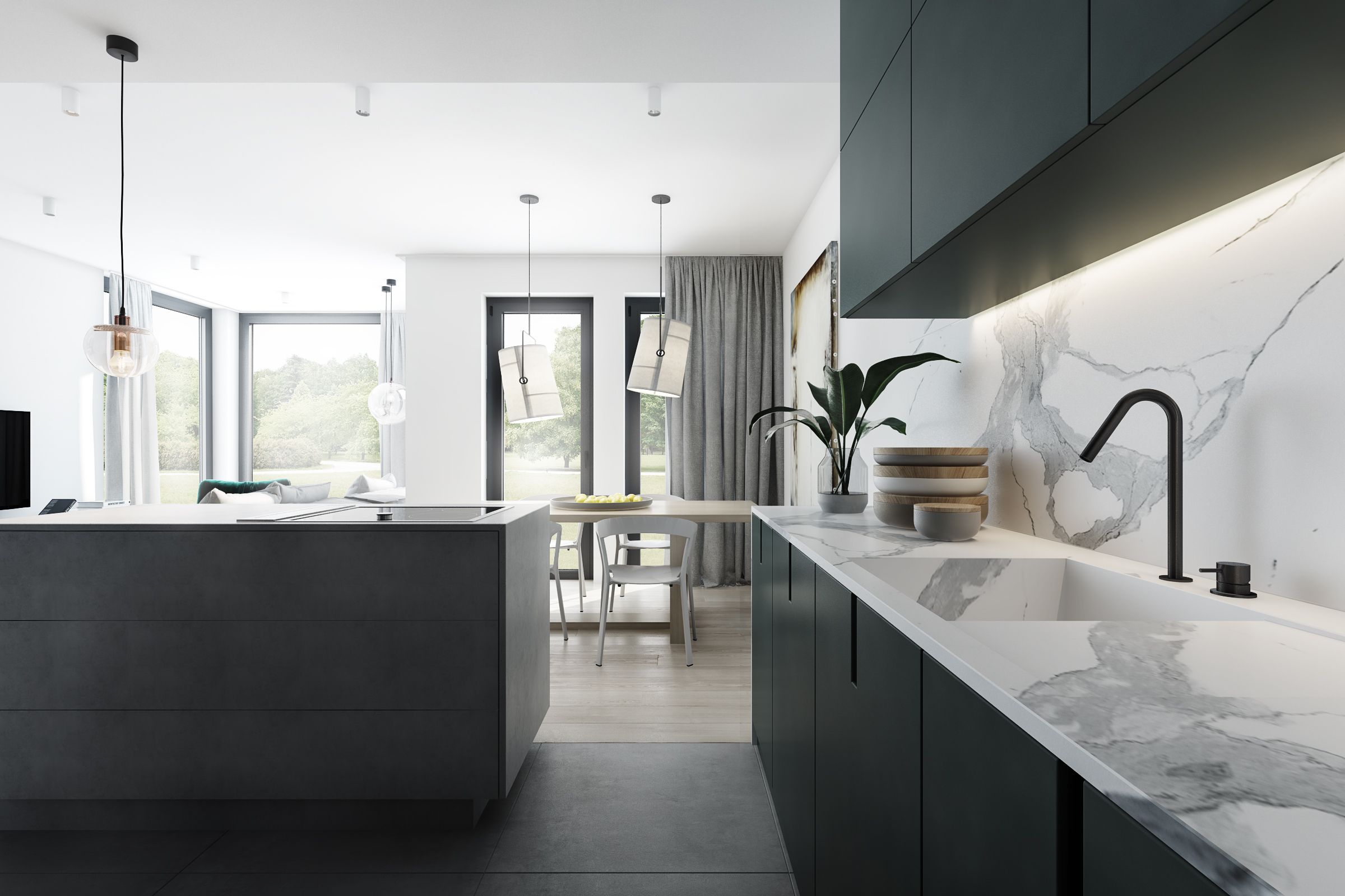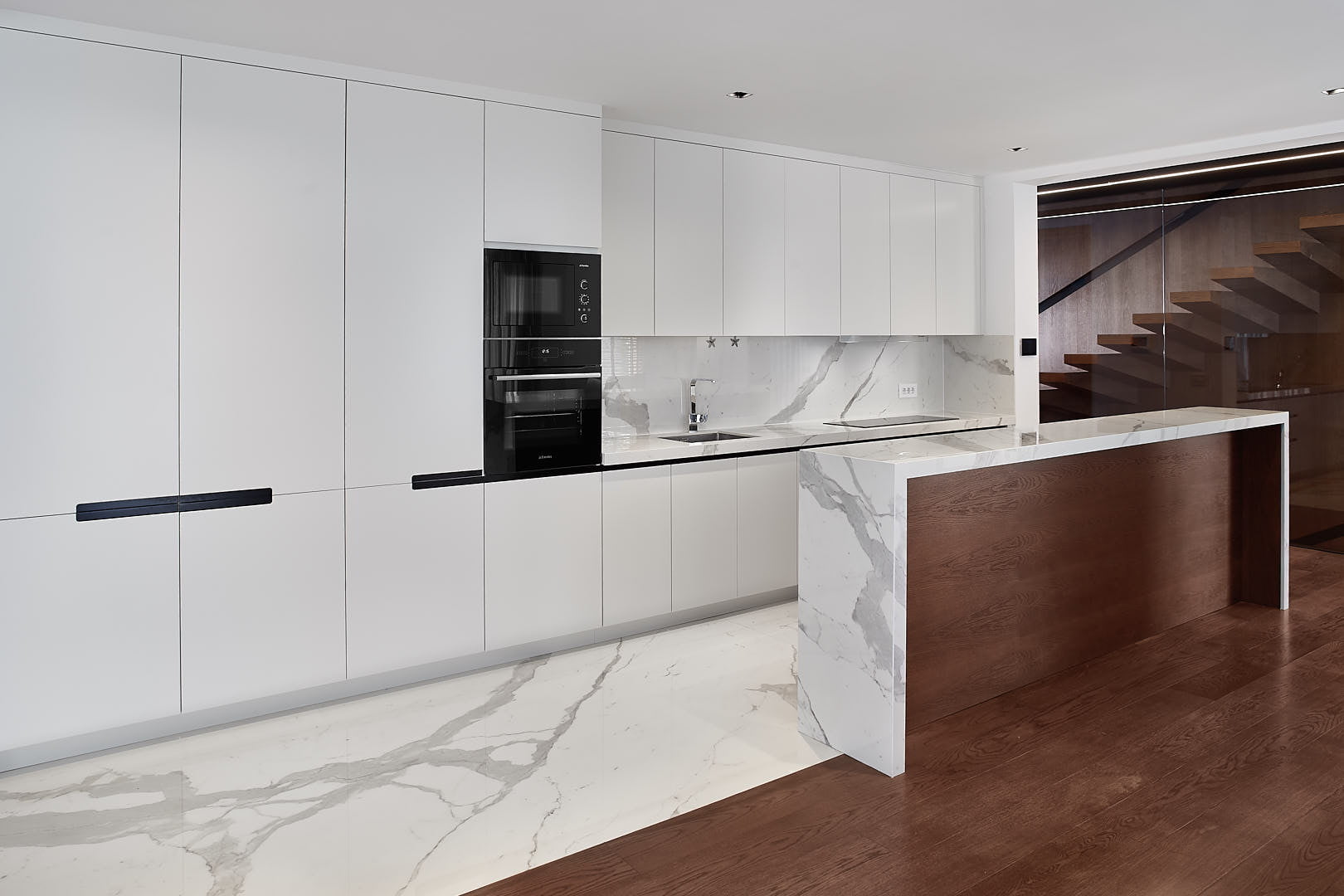 - Güçlü Damar Yapısı: Standart mermerlerin aksine, beyaz zemin üzerinde silik değil; net, keskin ve koyu gri tonlarında cesur damar geçişlerine sahiptir.