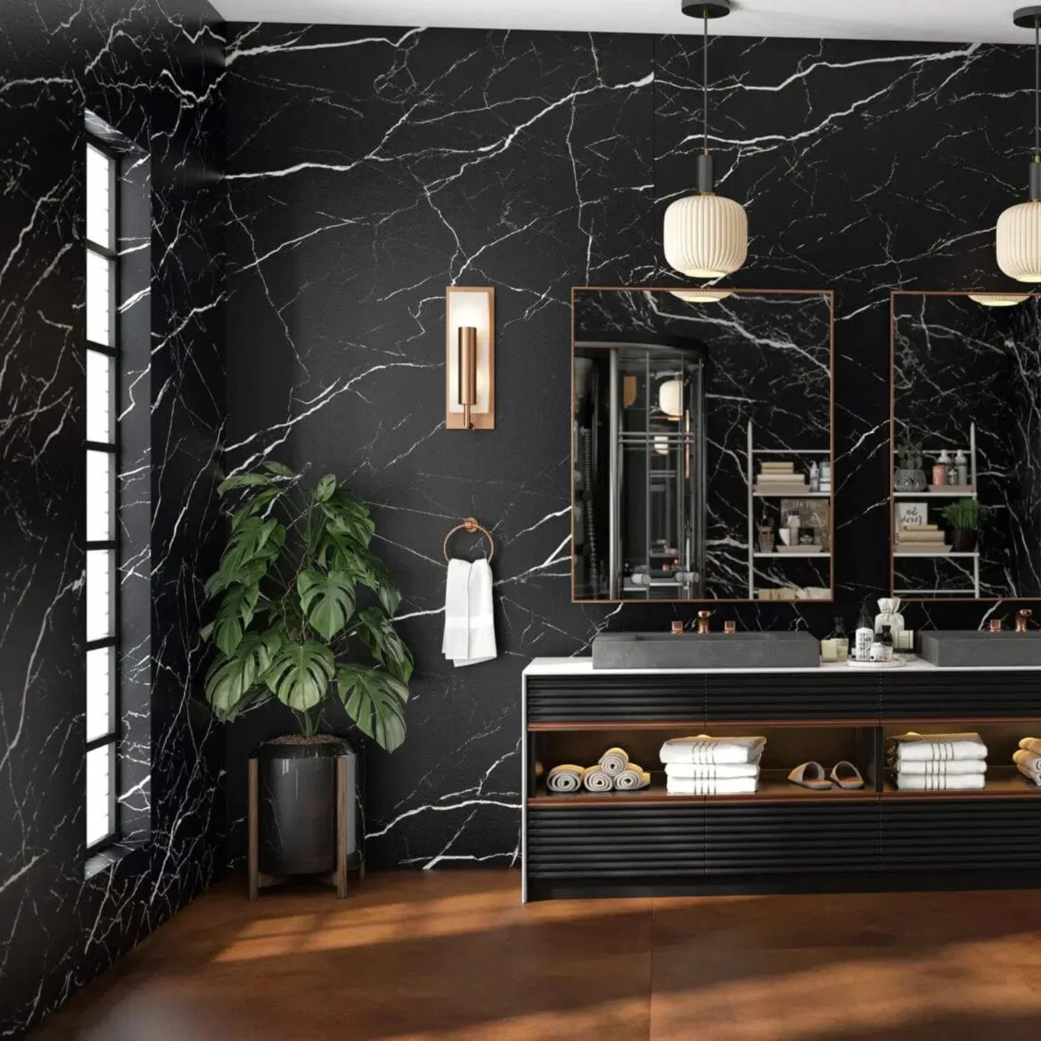 - Çarpıcı Görsel Kontrast: Derin siyah zemin üzerine dağılmış yoğun beyaz ve yer yer oksi-sarı damar yapısıyla (breşli doku), uygulandığı mekanda sıradanlığı kırar ve güçlü bir karakter ortaya koyar.